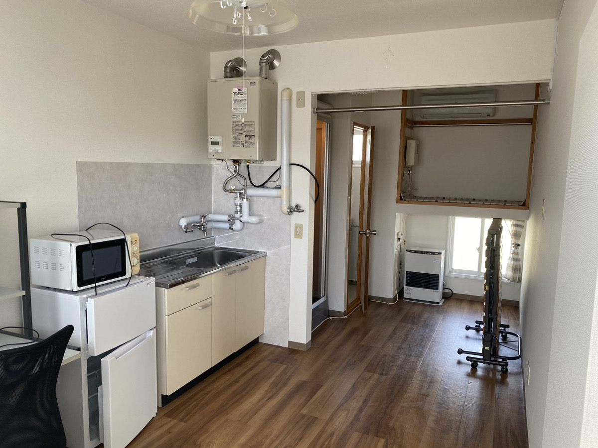 | 設備 | ベッド、机、椅子、テレビ、収納、冷蔵庫、電子レンジ、照明、冷房、カーテン、灯油ストーブ、シャワー、トイレ、キッチン |